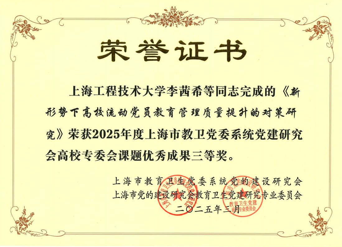 近日,由市教卫工作党委系统党建研究会秘书处发布的《关于表彰2024年党建研究课题优秀成果的决定》(沪教卫党研[2025]2号)获悉,我校李茜希等同志《新形势下高校流动党员教育管理质量提升的对策研究》获得2025年度上海市教卫党委系统党建研究会高校专委会课题优秀成果三等奖。